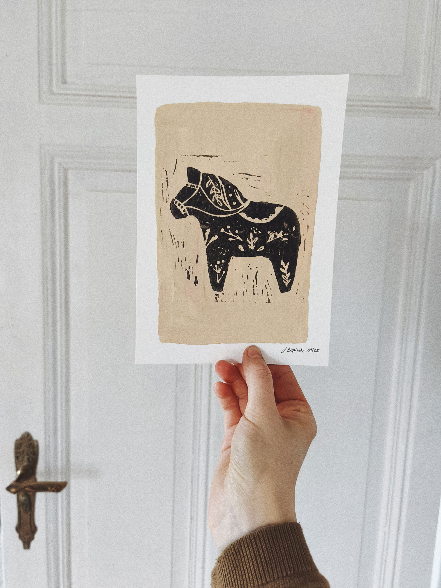 Meine kleine, weihnachtliche Linoldruck-Auflage ist entstanden – ein Herzensprojekt, da ich sowohl die Dala Pferde, als auch die Linoldruck Technik sehr gerne mag. Wenn du dir ein Stück Schweden nach Hause holen möchtest.