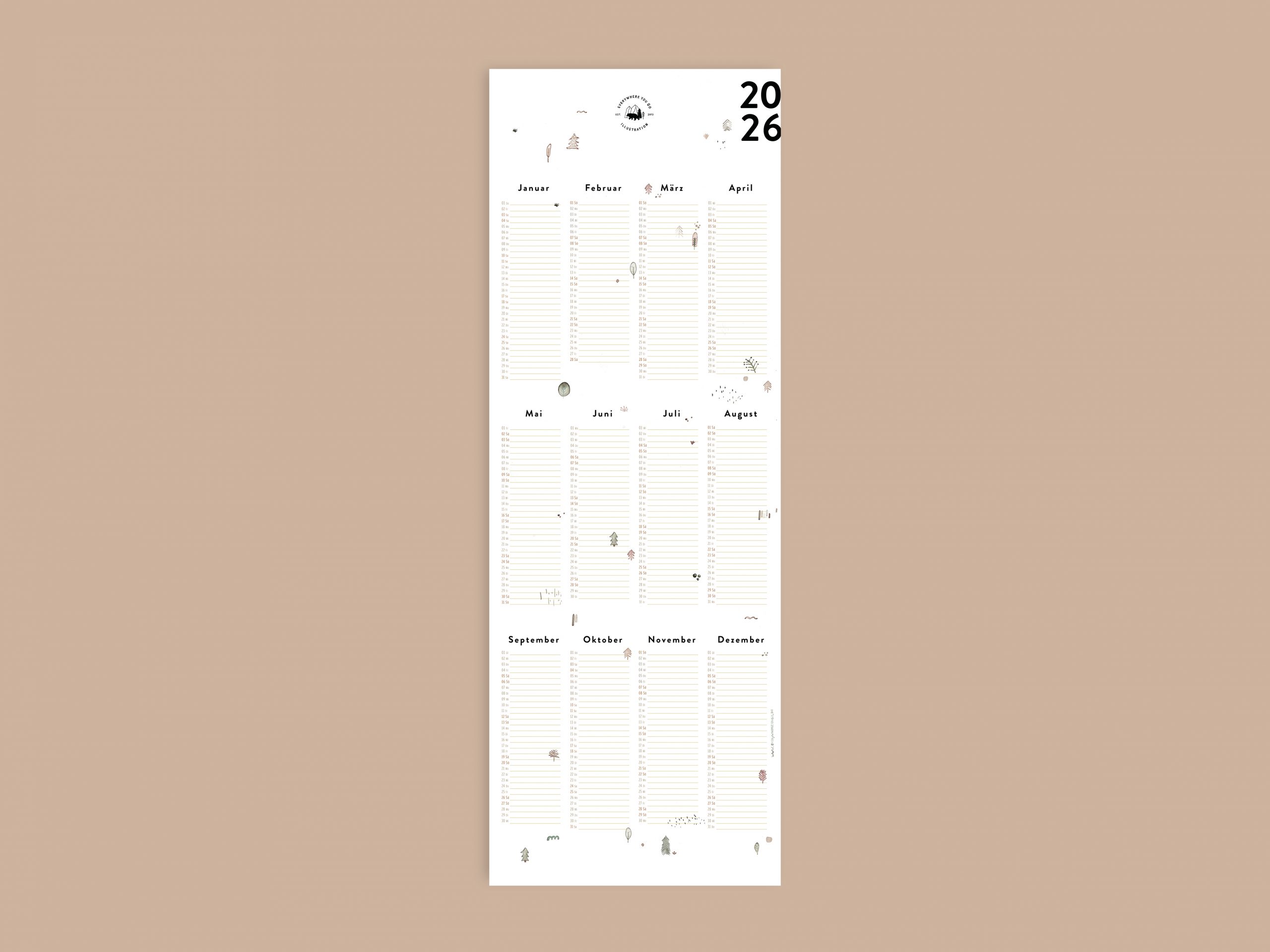 Mit diesem Wandkalender für 2026 habt ihr das ganze Jahr im Überblick. Durch das schmale Format passt der Kalender an jede Wand.